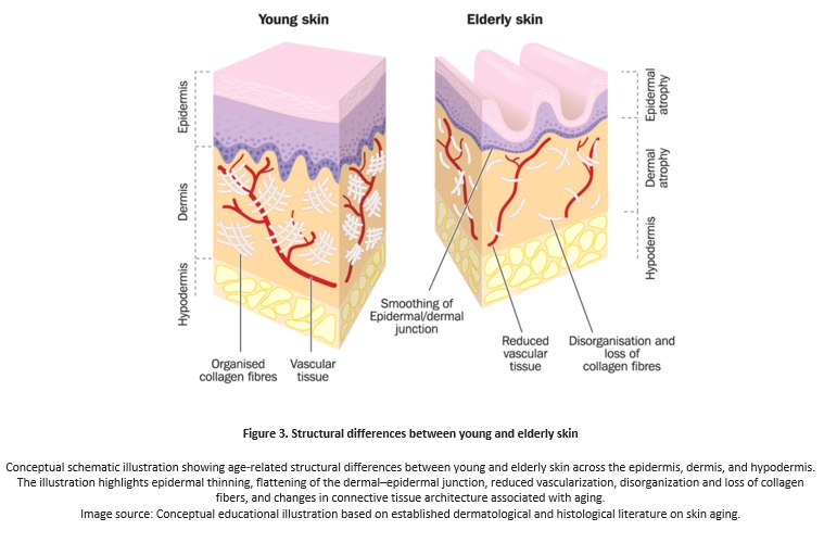 With aging, reduced collagen and elastin integrity limits this recovery, allowing mechanical forces to become progressively fixed along lines of movement. Clinically, this process appears first as fine lines, followed by dynamic wrinkles during expression and, over time, static wrinkles visible at rest. Wrinkles therefore reflect the cumulative effect of repeated mechanical stress acting on skin with diminished repair efficiency.