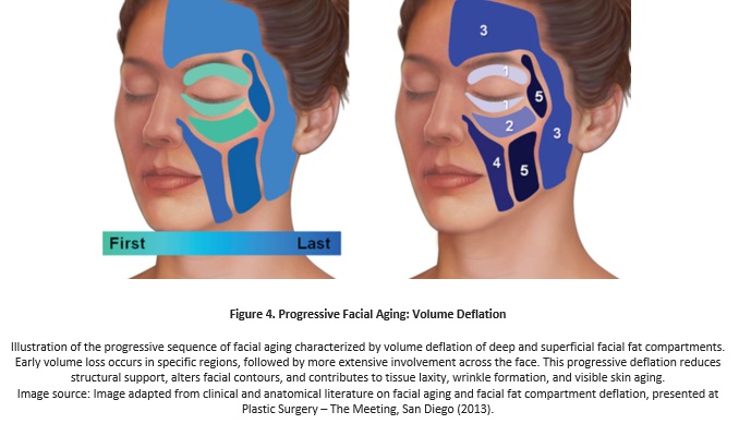 These changes alter facial mechanical balance, leading clinically to deflation in some areas and relative fullness in others, with altered contours and proportions. Volume redistribution often accentuates laxity and wrinkles, contributing to a more fatigued or aged facial appearance.