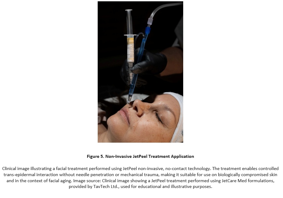 Environmental stressors further accelerate these changes by impairing hydration, protein stability, and extracellular matrix function. Within this context, JetPeel by TavTech represents a non-invasive, non-contact approach specifically suited for biologically compromised and aging skin. When combined with JetCare Med by TavTech formulations enriched with osmolytes, it actively supports skin hydration, a fundamental requirement for maintaining biological efficiency in aging tissues, while invigorating collagen and elastin, protecting peptides, and stabilizing proteins at a time when protein degradation and functional decline are increasingly prominent.
