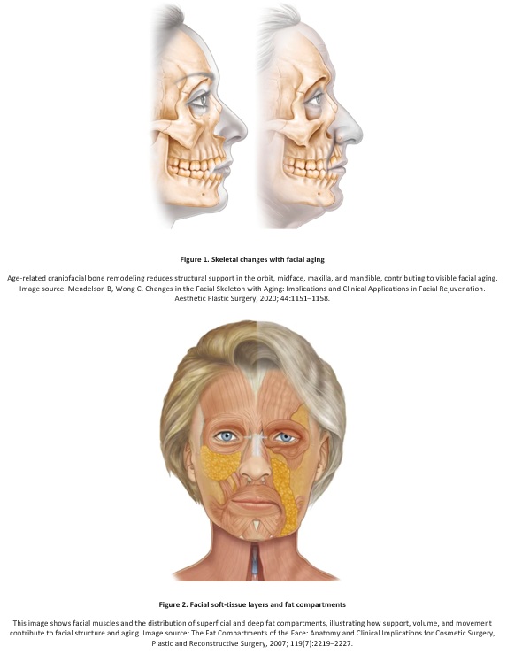 Facial aging is a progressive, multidimensional process, where gradual remodeling of bone, soft tissues, fat compartments, and muscle dynamics alters facial support and mechanical balance. This “inside-out” process precedes visible surface manifestations. As structural support and biological efficiency decline, the skin’s capacity for repair and adaptation is reduced. The visible signs of facial aging represent the combined effect of structural remodeling, mechanical stress, biological changes, and environmental influences acting together.